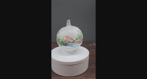 Set on a frosted glass bauble is a beautiful winter forrest scene complete with roaming deer and winter cabin. Wraparound design ensures you're always looking at something beautiful.