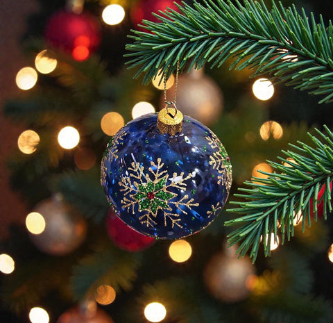 Blue Blown Glass Ornament - Green & Gold Snowflake - Blue Ornament - Hand Made In Ukraine - Hand Painted - Keepsake Ornament-Transparent Glass