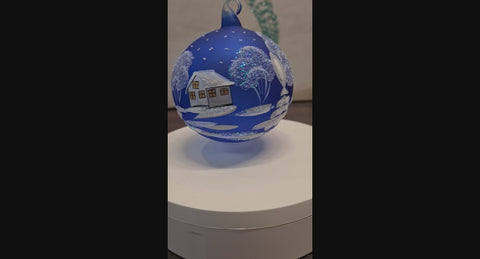 Blue Blown Glass Large Ball Ornament - White Church Design